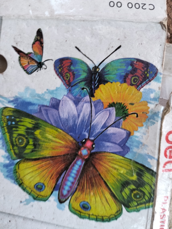 A vibrant image showcases three butterflies amidst floral elements. The largest butterfly, positioned at the bottom, displays striking yellow and green wings with red and blue accents on its body. Above, a blue and green butterfly perches on a purple flower near a yellow daisy. A smaller, colorful butterfly with orange and blue hues flits in the upper left corner. The background appears to be a light, slightly textured surface.