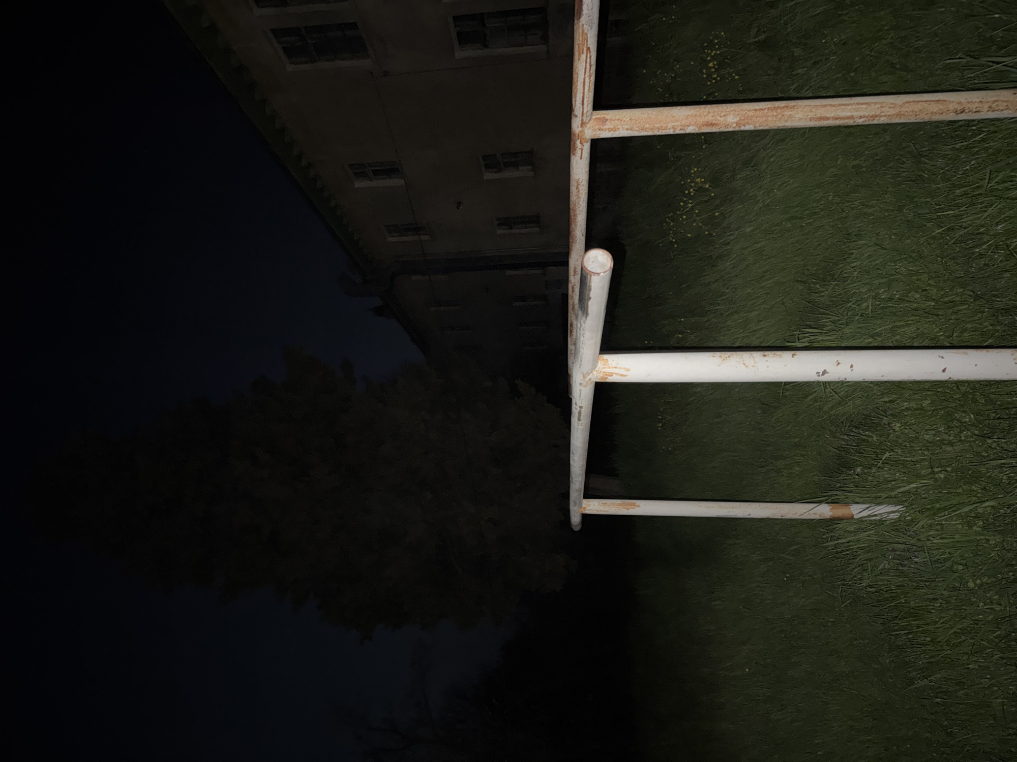 The image depicts an outdoor scene at night. A partially visible building with multiple windows is located on the left side, with the windows appearing dark. In front of the building is a tree. The right side of the image shows green grass and a metal structure that resembles a ladder. The metal structure is painted white and shows signs of rust. The overall lighting is dim, with the left portion of the image appearing almost completely dark. It is not possible to determine if the location is actually in Atiya, Bulgaria.