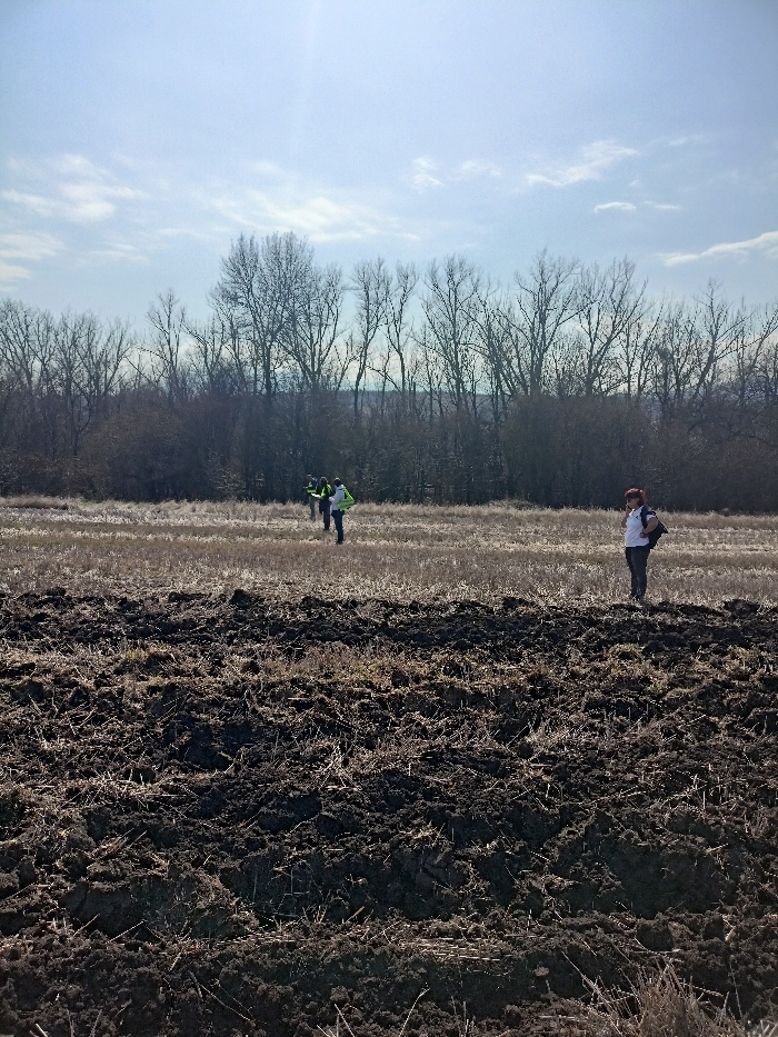 The scene depicts an outdoor agricultural or undeveloped field area under a bright, partly cloudy sky in Ivanyane, Bulgaria. The foreground consists of recently tilled, dark brown soil mixed with dry plant debris. Beyond this, the midground transitions to a lighter brown, unplowed area of dry grass or stubble. In this midground, a female subject stands on the right, facing slightly left. She is an adult with reddish-brown hair, wearing a white short-sleeved top, dark trousers, and dark shoes, with a dark backpack on her back. Further back and to the left, a group of three individuals is visible. At least two of these individuals are wearing bright green or yellow high-visibility vests. They appear to be standing or walking within the unplowed section of the field. The background features a dense line of deciduous trees with bare branches, indicating a late winter or early spring season, followed by a faint distant horizon.