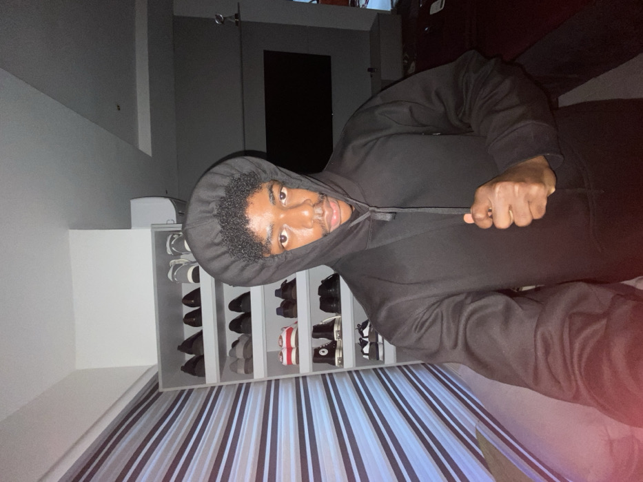 An individual is depicted indoors, in what appears to be a residence in Igboefon, Nigeria. The scene captures a young male with dark skin and dark, curly hair, facing the camera directly. He is wearing a black hooded sweatshirt with the hood pulled over his head; his right hand holds the drawstrings of the hoodie at chest level. To the left of the subject, a window with horizontal blue and white striped blinds is visible. Adjacent to the window is a multi-tiered white shelving unit or shoe rack containing several pairs of shoes, including dark formal shoes, sneakers, and black high-top shoes. Above the shoe rack, a white air conditioning unit is mounted. The background to the right of the subject is darker, featuring a large, wall-mounted dark flat-screen television above a low, dark piece of furniture. A small, reflective object or trophy is visible on a higher surface to the right of the television. The lower right foreground shows a dark surface, possibly part of a bed or sofa. Lighting appears to emanate primarily from the left, illuminating that side of the room and the subject's face more brightly than the right side. A faint reddish hue is present in the lower left corner of the image.