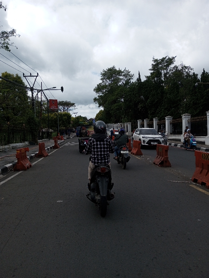 The image depicts a street scene in the city of Taohom, Laos, under an overcast sky. The asphalt road features two visible lanes. In the foreground, a person wearing a black and white plaid shirt, tan trousers, and a black helmet with a white emblem rides a dark gray scooter-style motorcycle, moving away from the viewer. Behind this motorcycle and slightly to its right, another individual on a dark motorcycle, wearing a dark jacket and helmet, proceeds in the same direction. Orange plastic traffic barriers line both sides of the road, delineating the main lanes from the curbs. On the left side of the road, a dark metal fence borders an area of dense green trees and foliage. Utility poles with overhead wires are visible, along with a traffic light structure and a red banner further down the road. On the right side, an ornate white and dark fence with pillars runs alongside the road, backed by numerous green trees. A white SUV is visible in the opposing lane, positioned further down the road, and at least two other motorcycles, including one light blue with two occupants, are present near the right-side fence. The scene indicates moderate urban traffic flow under cloudy conditions.