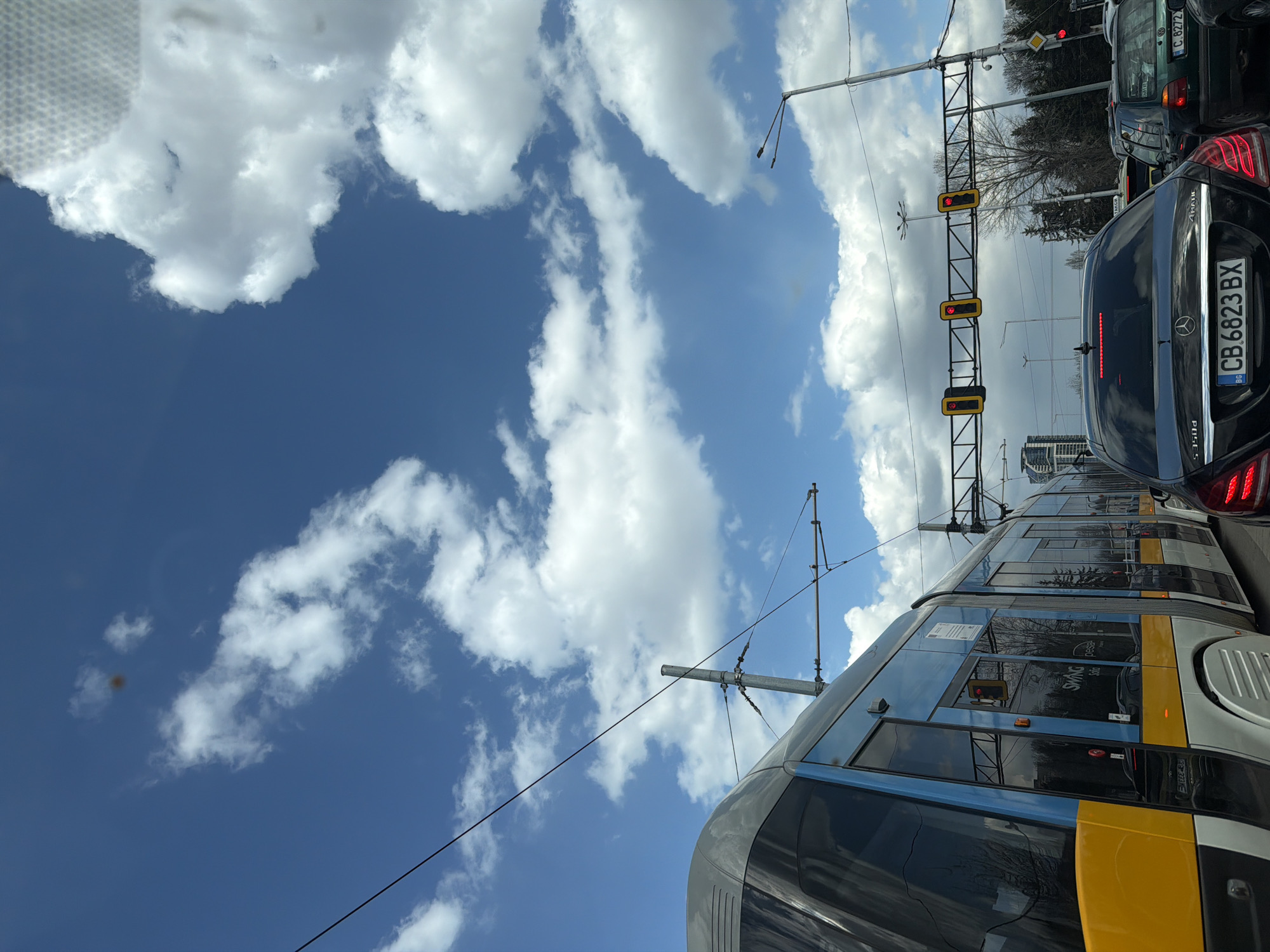 The image captures a street scene in Sofia, Bulgaria. A modern tram, painted in blue, silver, and yellow, is visible on the right side of the frame, moving towards the viewer. A black Mercedes car with the license plate "CB 6823 BX" is positioned next to the tram, appearing to be stopped in traffic. Overhead tram lines and a traffic light structure with red lights are present above the vehicles. The background includes trees and a partial view of a building, indicating an urban setting. The sky is bright blue with scattered white clouds. The image seems to have been taken from inside another vehicle, possibly stopped in traffic as well.