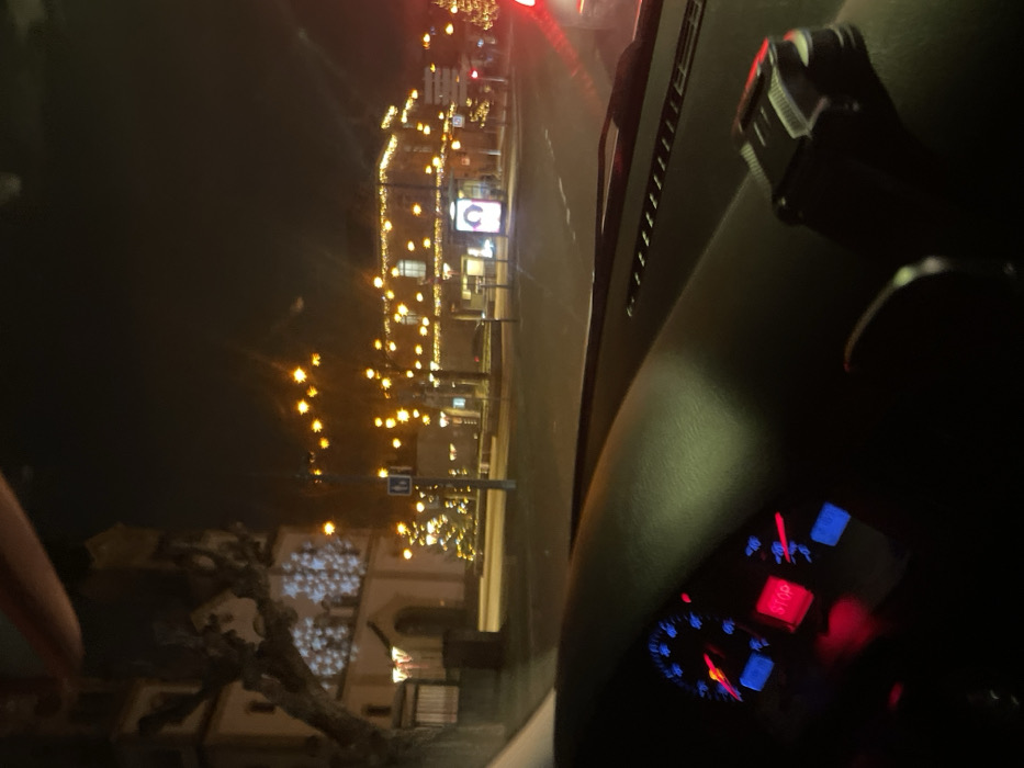 Nighttime scene viewed from inside a car. Lights illuminate a town with storefronts displaying holiday decorations. In the foreground, the car's dashboard is partially visible with illuminated gauges and indicators. The car's interior is dark. A phone mount is visible on the dashboard. The reflections on the car's windshield add to the light in the frame, obscuring the view.