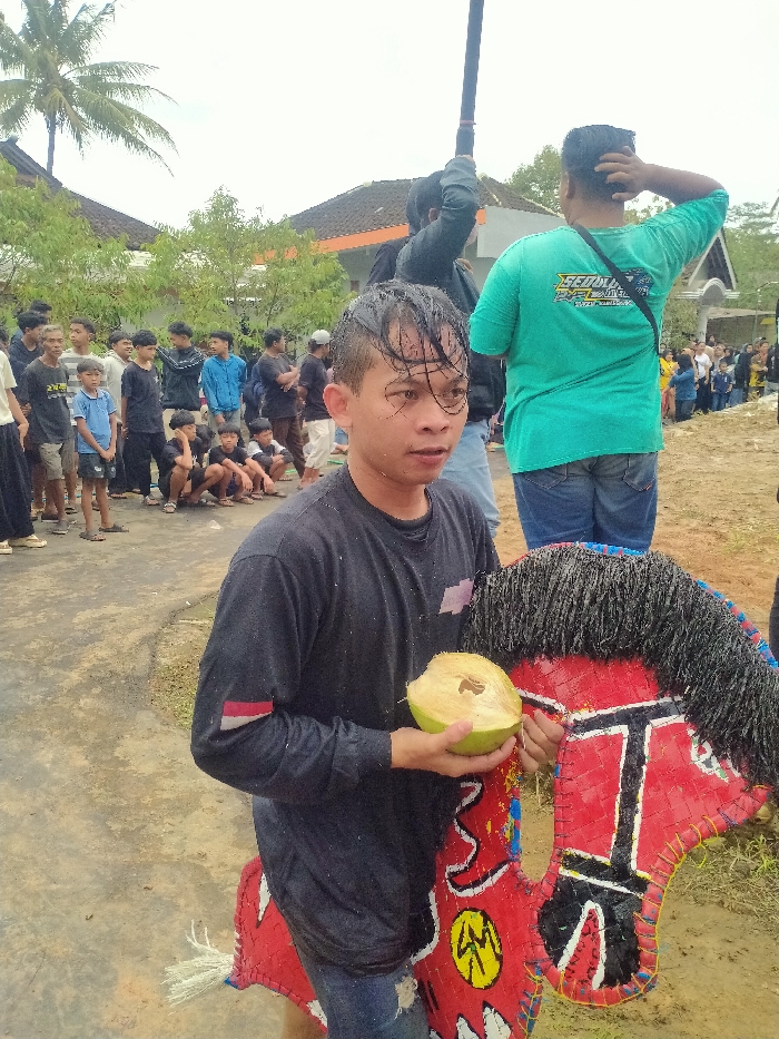 The image depicts an outdoor scene in Ganten, Indonesia, featuring an adult male in the foreground. He has wet, dark, disheveled hair and wears a dark gray long-sleeved shirt with a red and white striped emblem on the left arm, and blue ripped jeans. He holds a light green, halved coconut in his left hand, exposing its white interior, and supports a red, black, and white stylized horse-head prop, characteristic of a 'kuda lumping' or 'jaran kepang' performance, with a black fringed mane. His gaze is directed slightly right of the viewer. Behind the central figure, a crowd of approximately 25 to 30 individuals, predominantly males and juveniles, is present. Some stand on a wet, light gray concrete surface, while others squat. To the right, a man in a teal t-shirt and blue jeans stands with his back to the camera, his left hand on his head, positioned near another individual holding a long, dark vertical pole. The background features residential buildings with tiled roofs and orange and white wall sections, interspersed with dense green foliage and tall palm trees under an overcast sky. The ground transitions from a wet concrete path in the foreground to a dirt area further back, indicative of a semi-urban or rural environment.