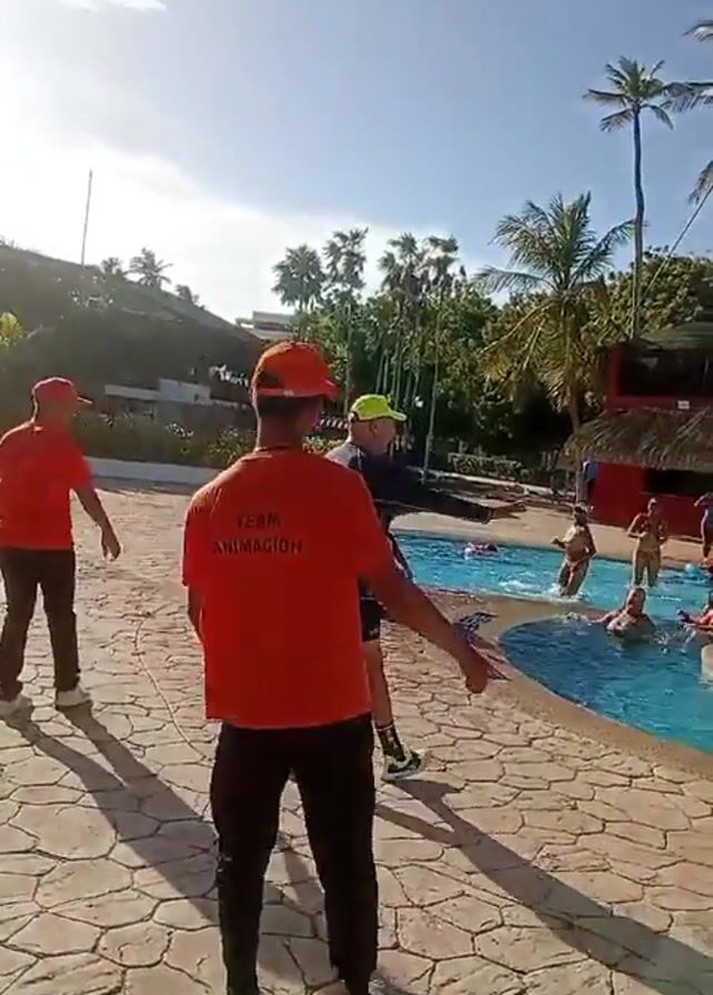 The scene shows a resort pool area under a sunny sky, dotted with palm trees. In the foreground, three people wearing orange "TEAM ANIMACION" t-shirts and matching hats, are dancing on a stone-paved area. One of them has curly hair. Beside them, a person in a dark shirt and shorts, wearing a neon green hat is also dancing. They are facing a pool where several people are swimming and engaging in water activities. Some of the swimmers are using inflatable rings. In the background, there are buildings with thatched roofs, typical of resort architecture. The camera is held by someone who is moving slightly while filming, providing a dynamic perspective of the scene.