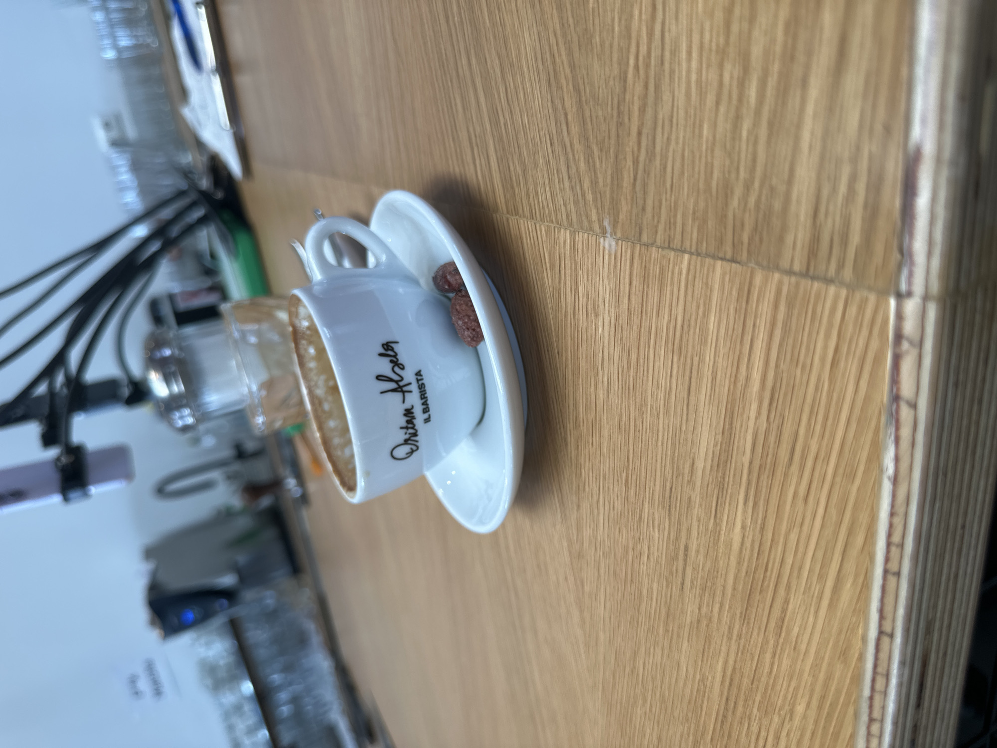 - "The image displays an espresso cup and saucer resting on a light brown wooden countertop within the Oritam Helsa IL BARISTA establishment, located at Kanalstraße 15, 40667 Meerbusch, Germany" by FM-cmwts1, licensed under CC BY 4.0