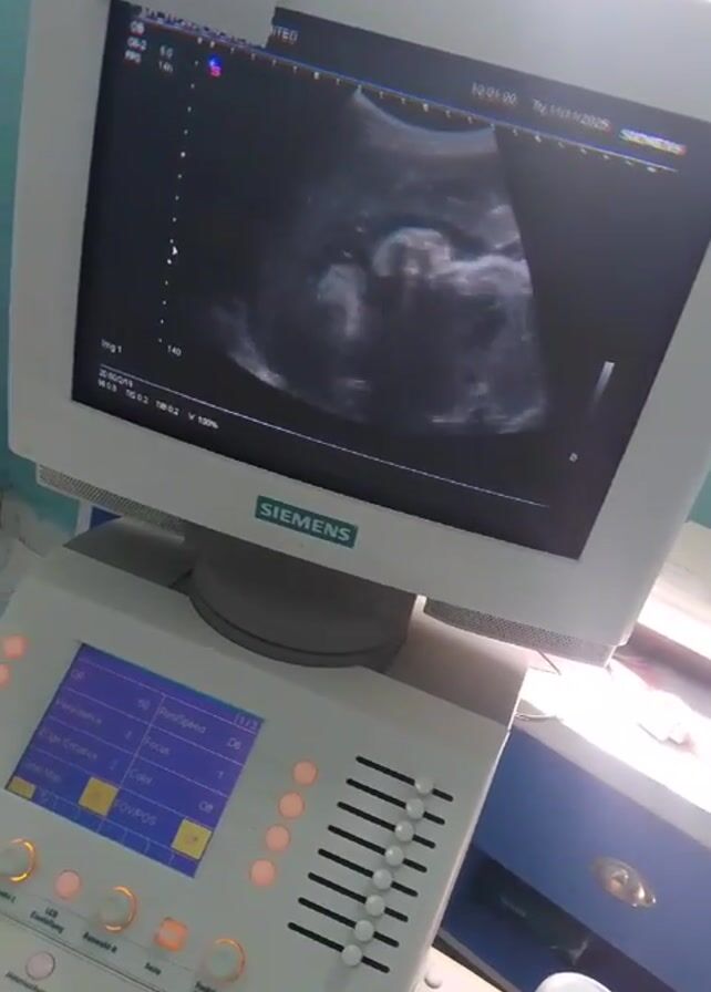 n ultrasound machine. On the monitor, the ultrasound image of a fetus is visible. The Siemens logo is visible on the bottom of the monitor. Below the monitor is the machine's control panel with buttons, dials, and sliders. In the background, there is a cabinet. A bottle of ultrasound gel is briefly visible. The camera is stationary.