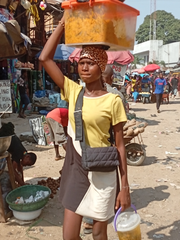 A woman balances a large container of food on her head in a bustling outdoor market. She wears a patterned headscarf, a two-toned dress, and a cross-body bag. In her hand, she holds a plastic container with liquid. People and vendors surround her, with stalls displaying various goods. The ground appears sandy and uneven. A three-wheeled cart is positioned behind her.