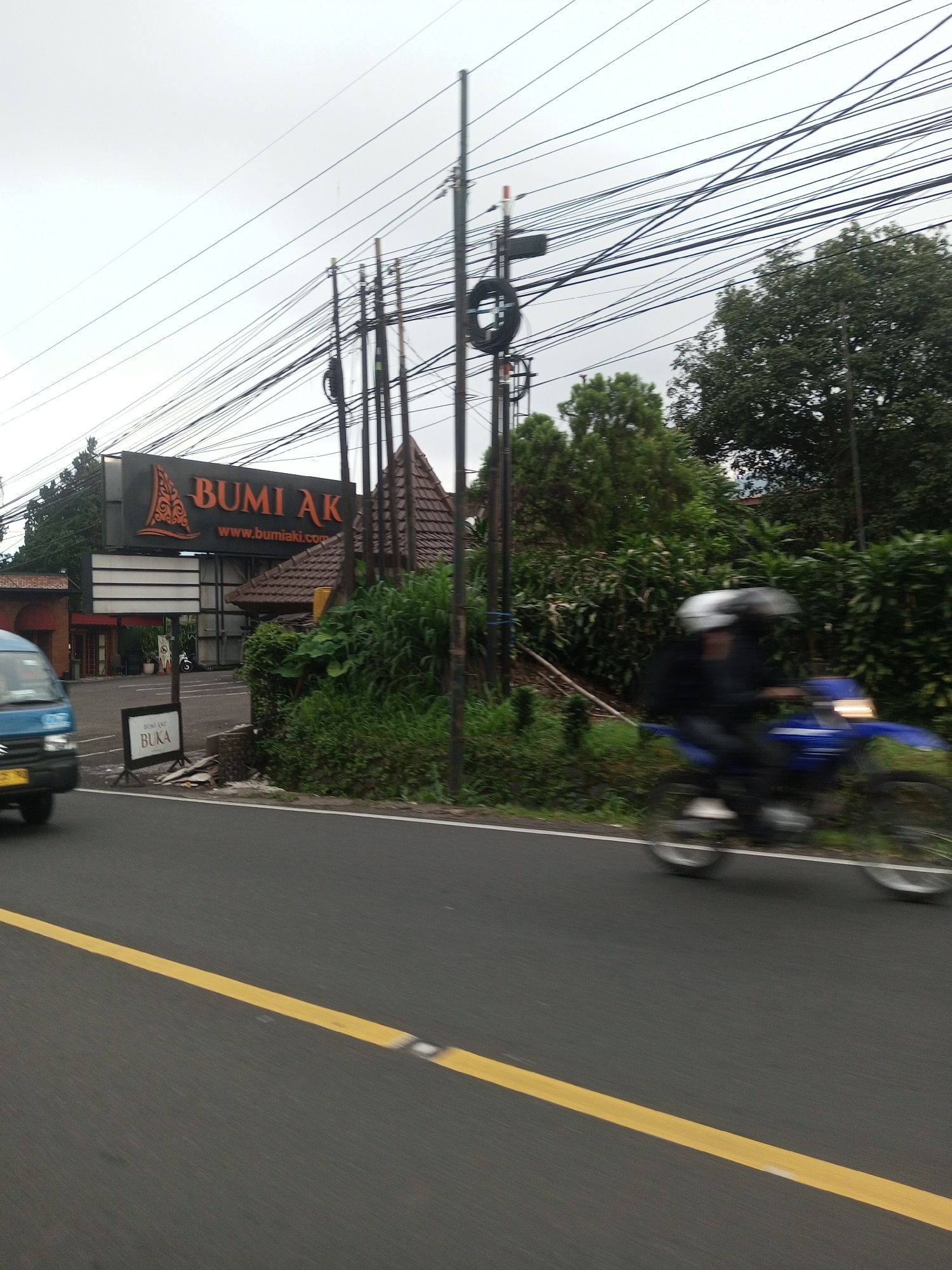 The image depicts a street scene in Ciherang, Indonesia. A blue van is visible on the left side of the road, adjacent to a sign that reads "BUMI AK" with the website "www.bumiaki.com". The sign also has "BUKA" underneath on a secondary sign, presumedly indicating it is open. Behind the sign are structures with traditional peaked roofs, nestled amidst dense greenery. Overhead, a web of electrical wires dominates the sky. A motorcycle is in motion on the right side of the road, with the rider wearing a helmet. A solid yellow line marks the road. The sky appears overcast.
