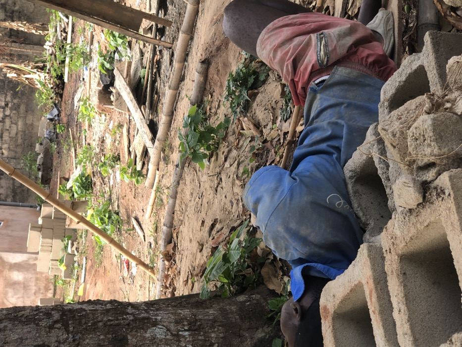 This image, set in an unkempt outdoor area in Alor, Nigeria, depicts an individual lying on their left side on the ground. The person is positioned with their back against a large tree trunk on the left and their head resting on or near several hollow concrete blocks. They are clad in a soiled, long-sleeved blue garment, soiled reddish-pink lower garments, and a black head covering. A white shoe is visible on their right foot. The immediate ground consists of sandy dirt, dry leaves, and small green plants. The environment behind the individual is a barren, uneven dirt landscape containing sparse green vegetation. Scattered objects include several bamboo poles, some upright and some lying horizontally, and various weathered wooden planks. In the background, a light brown building with exposed concrete block or plaster walls is visible, possibly under construction or unfinished. A concrete block wall stands behind this structure. The scene is illuminated by bright, natural daylight.