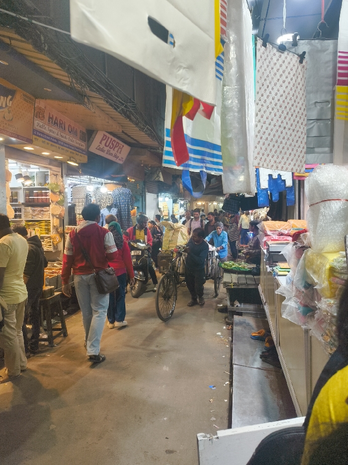 The image depicts a densely packed, narrow market street in Kolkata, India, illuminated by artificial lighting
