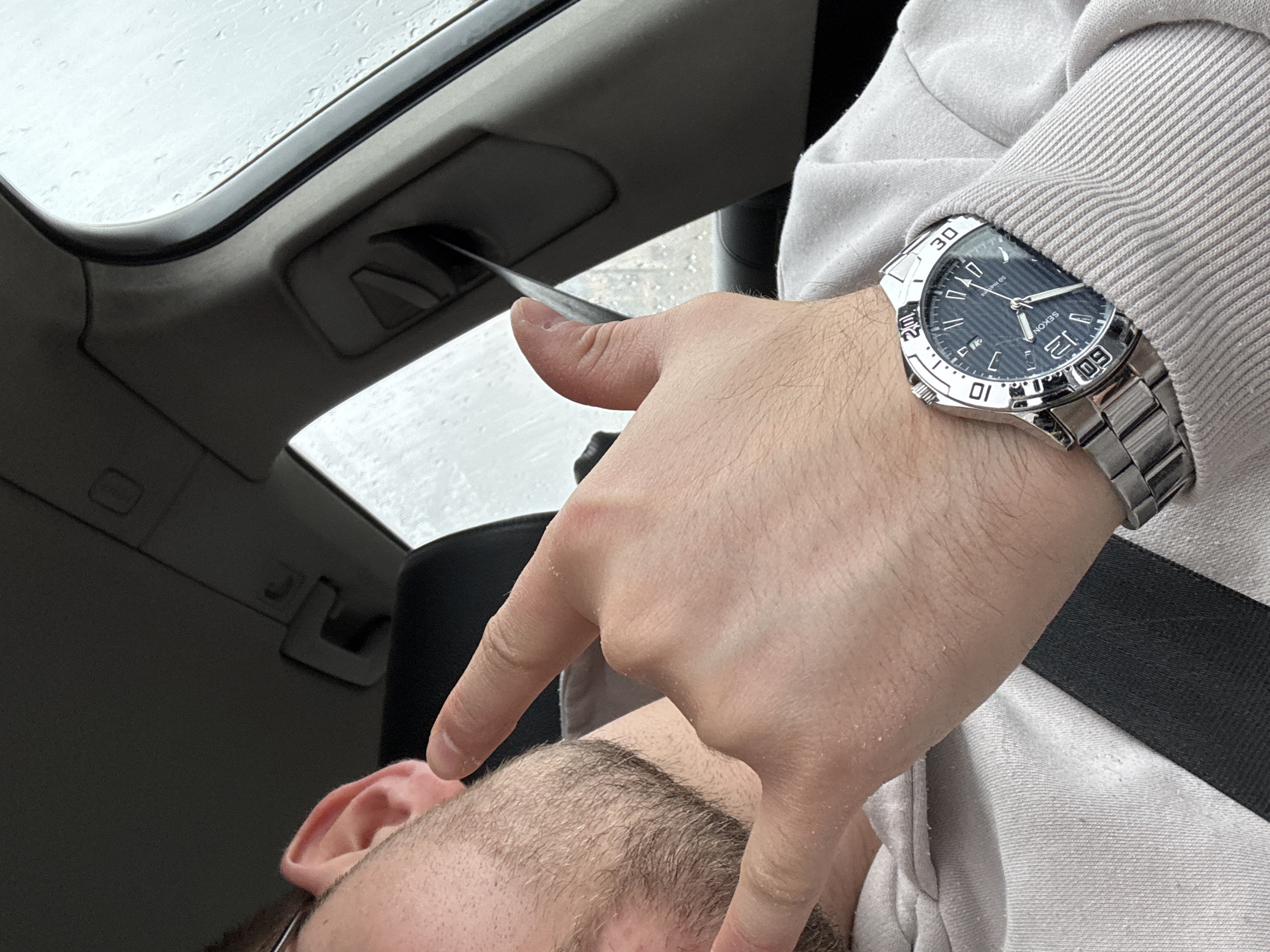 An indoor, close-up image depicts a male individual partially visible from the chest up, seated inside a vehicle in the city of Sofia, Bulgaria. The individual's left ear, stubble along the jawline, and a portion of his left temple are visible on the left side of the frame. He is wearing a light grey hooded sweatshirt. A black seatbelt extends diagonally across his chest and shoulder. His right hand is prominently displayed in the center, forming a "horns" gesture with the index and pinky fingers extended, and the middle, ring, and thumb fingers curled. A silver-toned "SEKON" wristwatch with a blue patterned dial, white indices, and a metallic link bracelet is worn on his left wrist. The vehicle's dark grey interior ceiling and a visible overhead fixture are present in the upper left. A car window on the right reveals an exterior with numerous raindrops, indicating wet weather conditions.