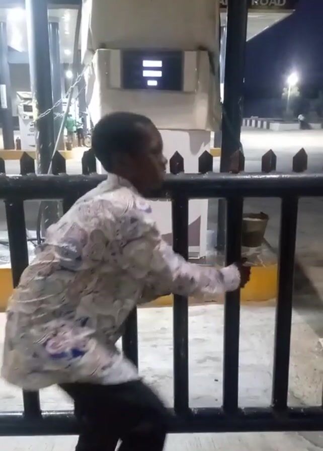 At a gas station during nighttime, a person in a patterned shirt and dark pants interacts with a black metal railing. The person is bent over, holding onto the railing with their hands. There is a gas pump in the background, and some other unidentified lights can be seen in the distance. The person appears to be smiling and making exaggerated facial expressions as they move along the railing.