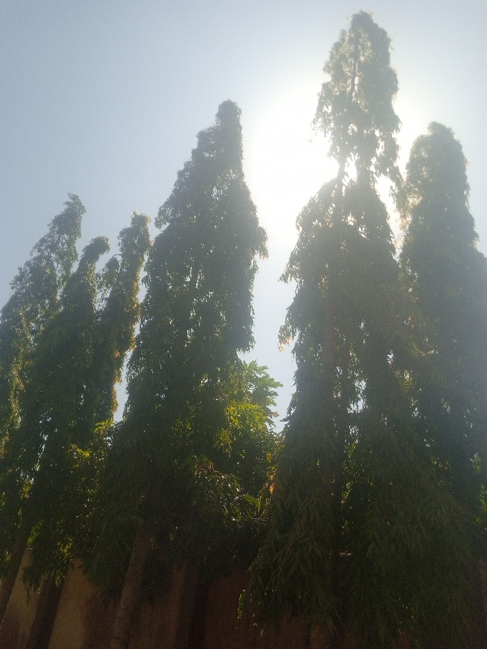 The image displays an upward-facing perspective of a dense row of several tall, slender trees, exhibiting dark green foliage consistent with *Polyalthia longifolia* (False Ashoka trees). The sun is intensely bright in the upper right quadrant, partially obscured by the tree canopy, causing significant glare and backlighting across the scene. The sky is clear and light, indicative of strong daylight. A light-brown or beige wall, possibly a building facade or boundary, is partially visible at the bottom of the frame, largely shadowed by the trees. No individuals, animals, or specific human activities are present. This outdoor environment is located in the city of Jos, Nigeria.