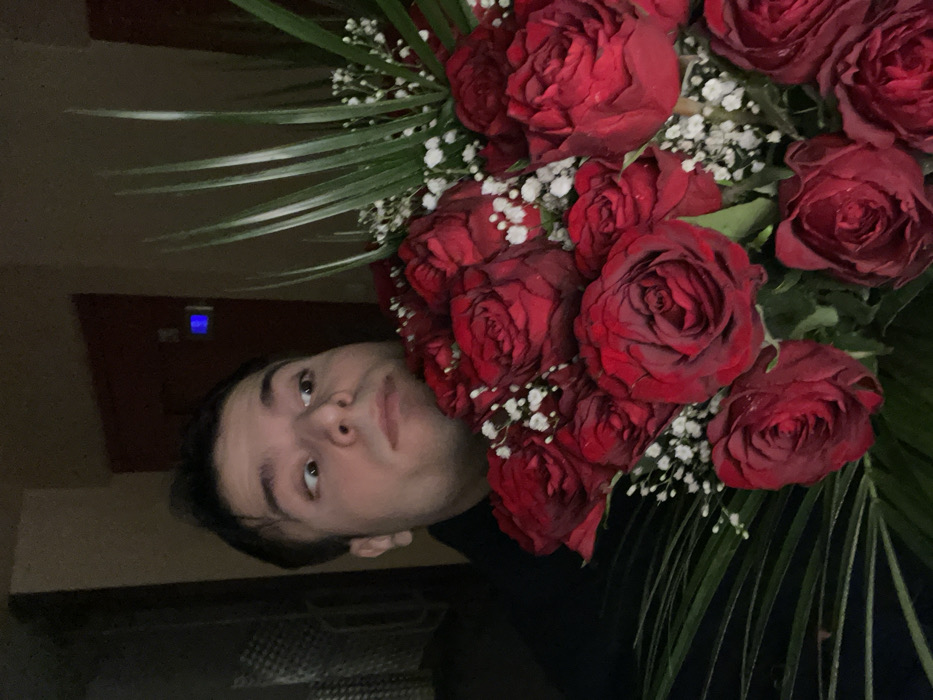 A young man with dark hair holds a large bouquet of red roses with baby's breath and greenery. He looks up and to the left with a slightly quizzical expression. He is wearing a dark shirt with a turtleneck. The background is dark, possibly indoors, with a blurry hint of a door and some reflective surfaces. The image is rotated slightly to the left.