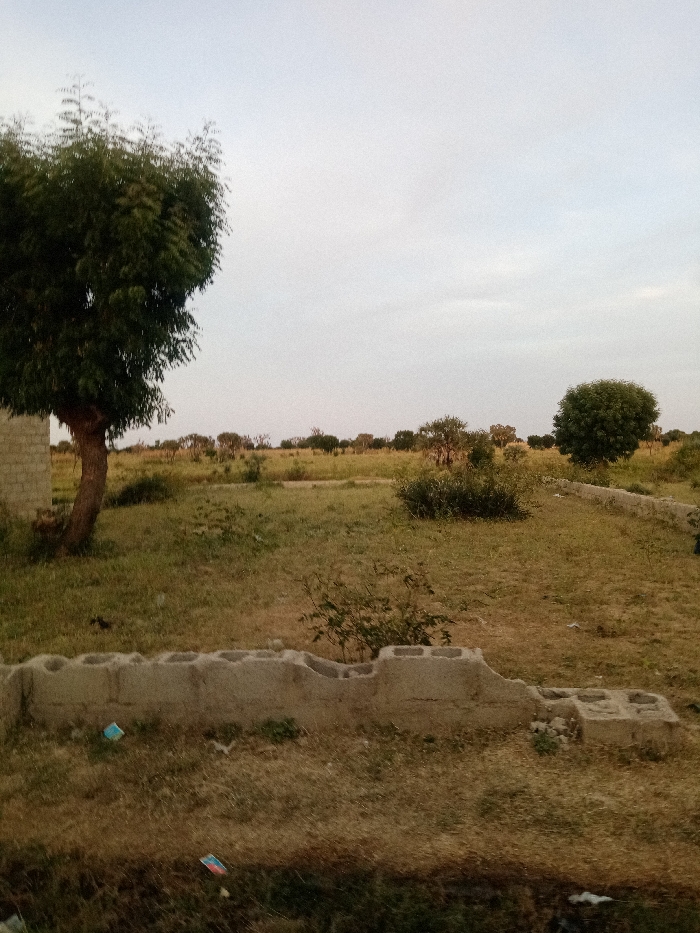 A grassy field under a cloudy sky features sparse trees dotting the horizon. In the foreground, a low, crumbling wall made of cinder blocks stretches across the lower frame. A mature tree stands to the left, while another is visible on the right. Scattered trash and debris litter the ground near the wall, suggesting neglect. The overall scene evokes a sense of rural decay.