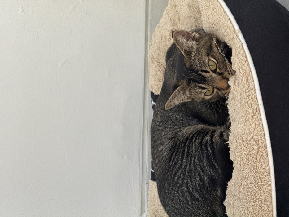 - "A tabby cat curls in a plush, beige and black pet bed situated against a white wall" by FM-LEP0K3, licensed under CC BY 4.0
