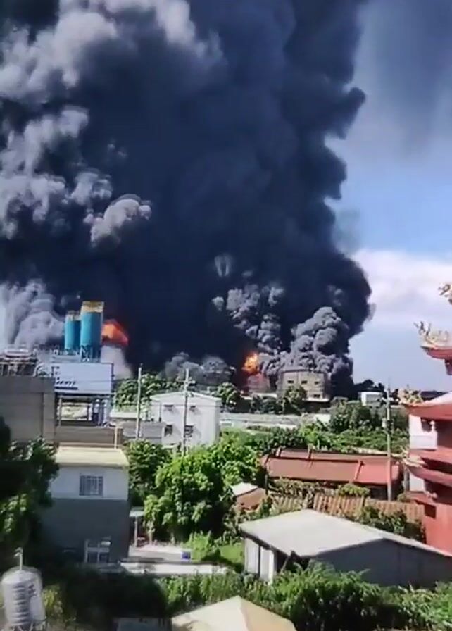 large plume of dark smoke rising from what appears to be an industrial area. Buildings, including a structure that looks like a temple or traditional building, are visible in the foreground. There are flames visible within the smoke plume. Trees and greenery are interspersed among the buildings in the middle ground. The sky is partly cloudy.