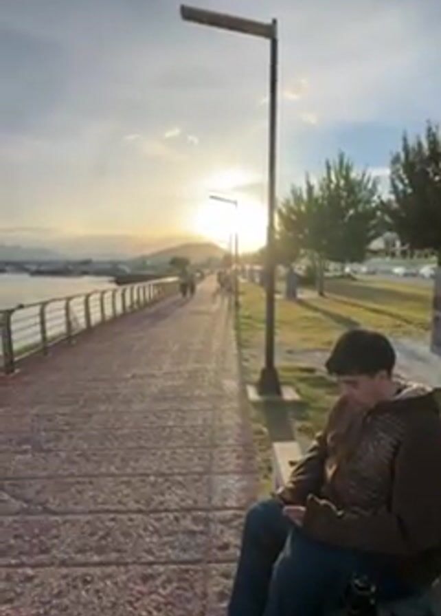 young man sitting on a bench along a waterfront promenade at sunset. He is wearing a brown hooded sweatshirt, blue jeans, and white sneakers, and is looking at his phone. A black water bottle and a brown bag are on the bench next to him. The promenade is paved with reddish-brown bricks, and there is a metal railing separating it from the water. Several cruise ships are docked in the harbor, and mountains are visible in the distance. There are lampposts lining the promenade, and trees and grass on the other side of the walkway. People are walking along the promenade. The sky is blue with some clouds, and the sun is setting.