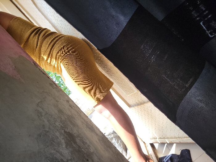 A person wearing a brown sweater is reaching or crawling through a narrow opening. One arm is stretched outwards. Part of the torso and legs are visible. A section of rough, gray concrete or stucco is on the left, while dark, textured material blocks the upper right. Metal grating is underneath. Outside greenery is visible through the opening.