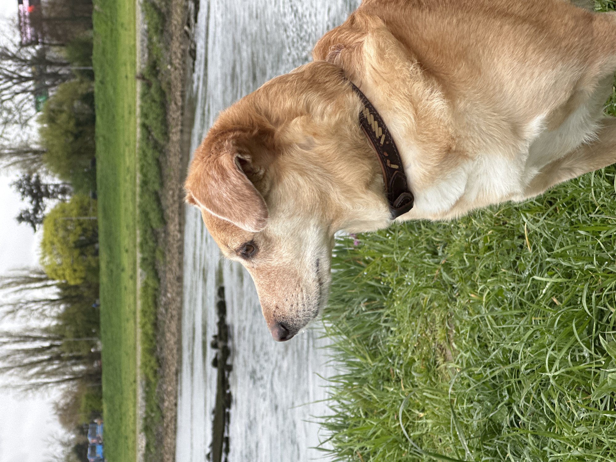 A medium-sized dog, light brown with a white chest and belly, is positioned in the foreground, facing left in profile. It wears a dark brown leather collar with a light-colored patterned inlay. The dog is situated on damp, dense green grass. In the midground, a river flows from left to right, containing multiple dark, partially submerged structures resembling rocks or remnants of a barrier. The far bank consists of a green embankment topped by a line of deciduous trees, some exhibiting new green leaves. Indistinguishable blue vehicles and other structures are faintly visible through the distant foliage on the far bank. The sky above is overcast. This scene is located along the Sava River within the City of Zagreb, Croatia.