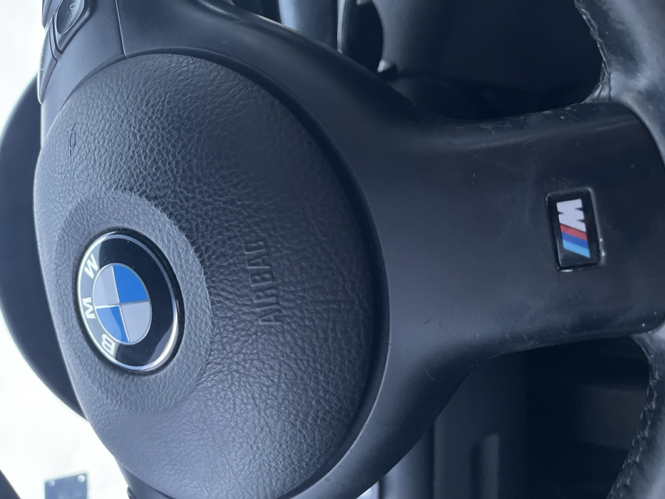 The image displays a close-up, slightly high-angle forensic view of a black, textured automotive steering wheel, devoid of any individuals. The central airbag cover features the circular BMW logo, rendered in blue, black, and white. Directly beneath this emblem, the word "AIRBAG" is embossed into the textured material. A small, rectangular BMW M logo, characterized by red, dark blue, and light blue stripes adjacent to a white "M", is positioned on the lower right spoke of the steering wheel. Portions of integrated control buttons are partially visible on the right-hand side of the steering wheel's rim. The background is an indistinct, bright, out-of-focus area, consistent with an overcast sky or interior ceiling viewed through a windshield. The specific location within the city of Byala, Bulgaria, is not discernible from the visual evidence.