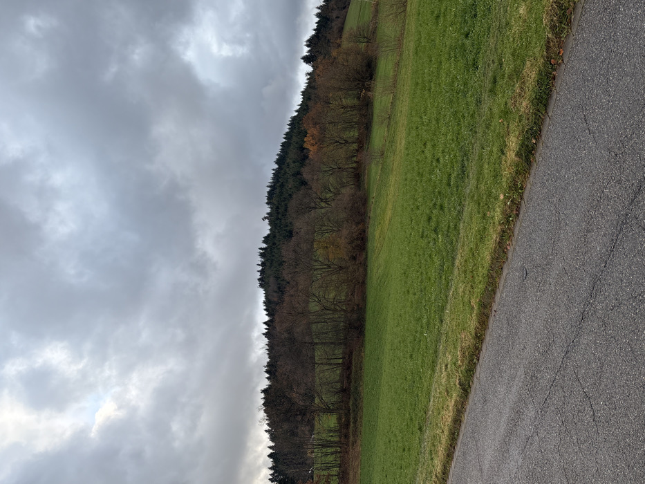 The image displays a rural landscape near Freiburg im Breisgau, Germany, under a heavily clouded sky. In the foreground, a dark grey asphalt road, exhibiting multiple cracks and light-colored lines, traverses diagonally from the lower left to the lower right. A narrow, discolored strip of grass and earth separates the road from a large, bright green grassy field that occupies the midground. Beyond this field, a line of deciduous trees with bare, dark brown branches extends across the width of the frame; a few individual trees retain patches of orange-brown foliage. Behind these deciduous trees, a dense, dark green coniferous forest covers the sloped terrain of a hill that rises into the background. The sky above is entirely covered by a thick layer of grey clouds, with a slightly brighter patch visible in the upper left corner. No individuals, vehicles, or artificial structures are discernible within the depicted environment.