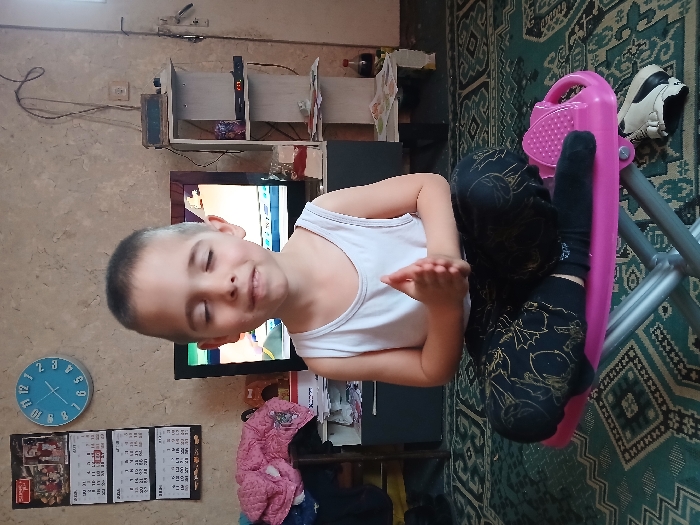 The scene depicts a young child seated indoors in Obrochishte, Bulgaria. The child, appearing male, has short light brown hair, light skin, and is positioned centrally. His eyes are closed, and his lips are slightly upturned, forming a gentle smile. He wears a white sleeveless undershirt and dark pants adorned with light-colored patterns. Dark socks are visible on his feet. His hands are pressed together at chest level, fingers interlocked. The child is seated cross-legged on a pink plastic stool with silver-colored metal legs. The stool rests on a teal-and-beige patterned rug covering the floor. A white and black shoe is visible on the rug to the right of the stool. In the background, a light-colored, textured wall is visible. On the left side of the wall, three white calendars are stacked vertically, displaying dates and images. Above them, a small framed picture is present. To the right of the calendars, a round, light blue wall clock with white numbers and hands is mounted. A dark-framed television screen is positioned behind the child, displaying colorful animated content. To the right of the television, a light-colored shelving unit with multiple tiers holds various items, including a dark box with a small digital display and other indistinct objects. Wires are visible extending from an electrical outlet on the wall, and a doorframe is partially visible on the far right.
