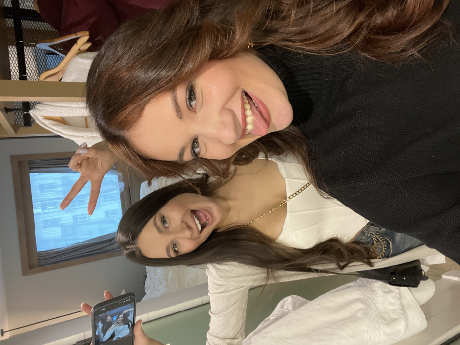 Two adult females are posing indoors, likely in a hotel room or apartment