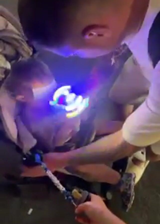 A low-angle shot reveals a child in a stroller being shown a brightly lit, spinning toy. The child has a bandage on their forehead. The toy is held by a person out of frame, who is showing it to the child. Another adult is partially visible, leaning over the stroller. The scene appears to be outdoors at night, possibly on a paved surface.