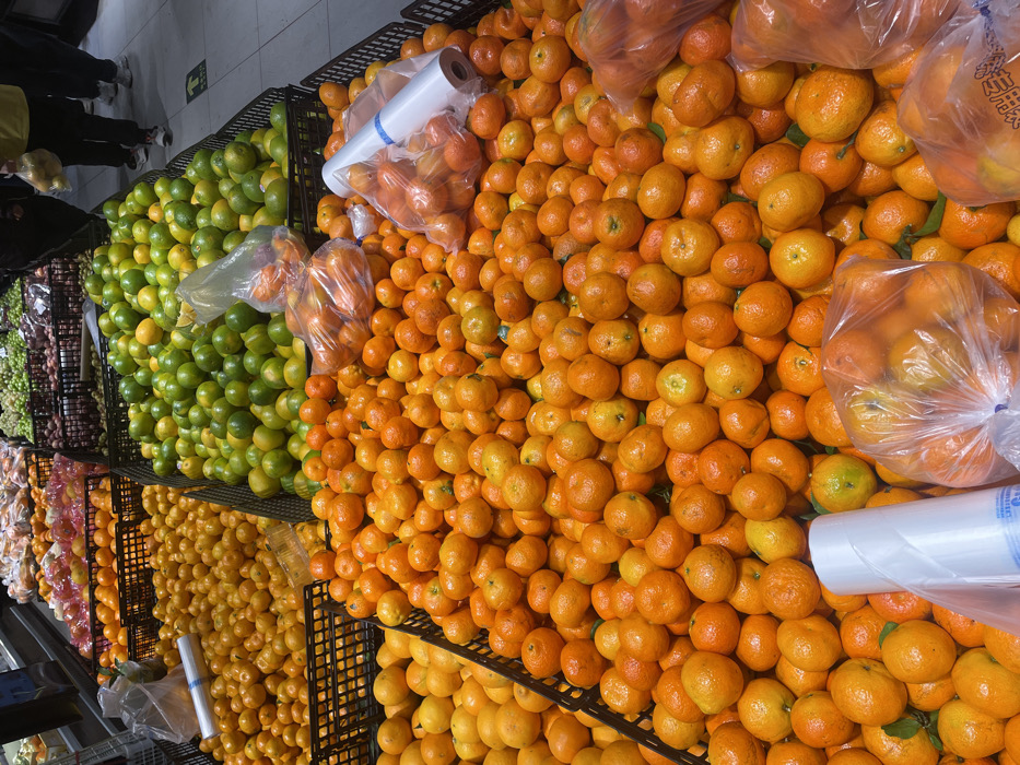 The image displays an indoor scene within a supermarket or grocery store located in Daxing District, China. The foreground is dominated by a large-scale display of various citrus fruits. Predominantly, small, orange mandarins or tangerines are piled in numerous black plastic crates. Adjacent to these, a section of green citrus fruits is similarly arranged in black crates. Further back, additional produce displays include red-colored fruits and green grapes. Several transparent plastic bags, some containing pre-packaged mandarins and one appearing as a rolled dispenser of empty bags, are placed within the fruit displays. In the background, multiple individuals are partially visible, primarily their lower torsos and legs, traversing a white tiled aisle. One person, wearing a yellow top, is observed carrying a white plastic bag filled with produce. A green directional arrow and a red circular 'No Entry' symbol are marked on the floor in the distant background.