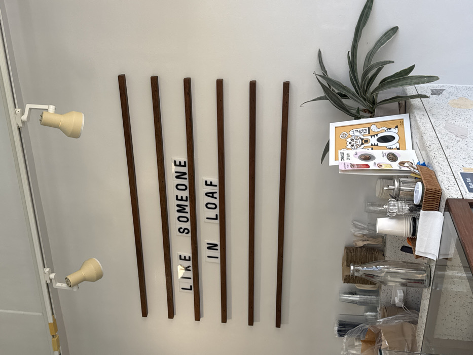 This is an interior image of a commercial establishment, likely a cafe or bakery, situated in Suthep, Thailand. The scene is dominated by a light-colored wall and a counter. On the upper portion of the wall, a track lighting system features two cream-colored directional spotlights. Below these lights, seven horizontal dark brown wooden slats are affixed to the wall, forming a message board. White rectangular letter tiles spell out "LIKE SOMEONE" on the third slat and "IN LOAF" on the fourth slat from the top. The counter directly beneath the wall has a light-colored, speckled surface. Arranged on the counter from left to right are various items: stacks of clear plastic cups, a clear glass bottle, a stack of round paper plates or lids, bundles of wooden forks/spoons, and several other containers. In the central area, a small wicker basket holds items, alongside a folded white napkin, a clear glass shaker, and a stainless steel condiment dispenser. On the far right, a white-framed picture with a yellow background depicts a cartoon white tiger holding a sign with Thai script, with visible English text "COMBO SET 129 Baht." Behind this picture, a potted plant with long, dark green leaves is positioned. No people are present, and no active interactions are depicted.