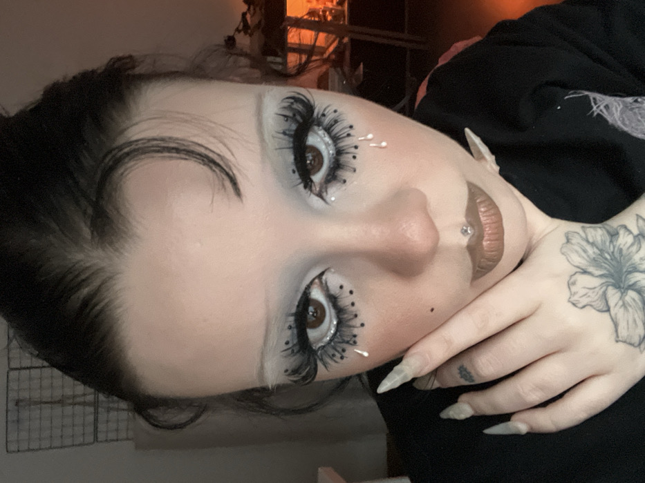 A close-up portrait shows an individual, identified as female, in an indoor setting in the City of Zagreb, Croatia. The subject has dark hair pulled back with a curved fringe segment on the forehead. Elaborate makeup is applied to the face, featuring white eyeshadow extending upwards from the eyes, exaggerated false eyelashes with black dots applied below the lower lash line, and two distinct white tear-drop shapes below each eye. The lips are coated with a muted brown lipstick, and a labret piercing with a clear gem is present below the lower lip. The person's left hand is positioned against their left cheek, displaying long, pointed, translucent artificial nails. A floral tattoo is visible on the back of the left hand, and a simple band tattoo encircles the left ring finger. The individual wears a dark, possibly black, garment. The background is dimly lit and largely indistinct, showing a light wall and a dark wire grid on the upper left, and a darker area with an amber light source on the right.