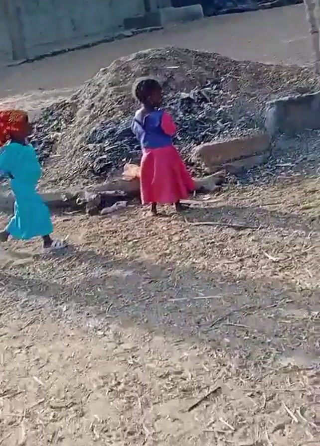 dirt yard outside a simple building. Three children, each wearing brightly colored traditional clothing, are walking and dancing on the dirt, with an adult woman in a yellow dress watching from the doorway of the building. The yard is dry with scattered debris. Another building and some trees are visible in the background. The children appear to be playing or mimicking dance steps. The camera is handheld and moves slightly, following the action.