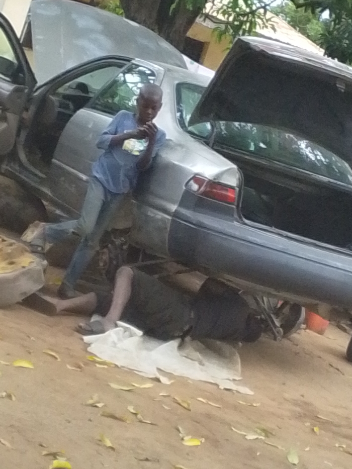 The image depicts an outdoor car repair scene in Adankolo, Nigeria