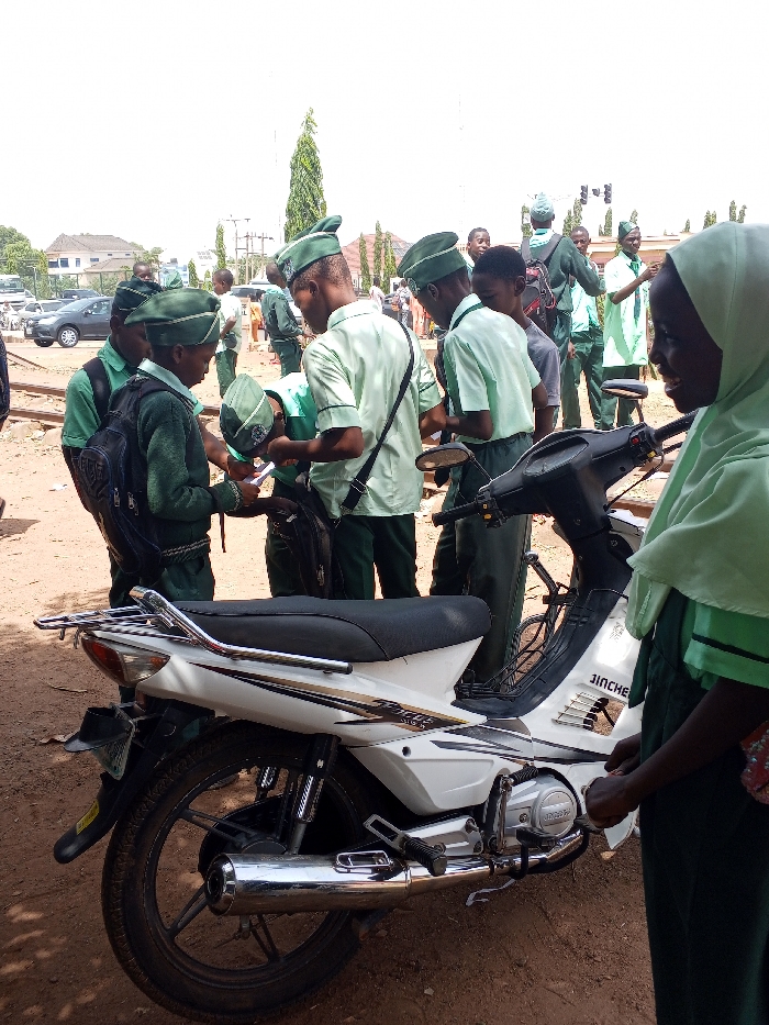 An outdoor scene in Hayin Banki, Nigeria, depicts multiple individuals, predominantly youth, gathered around a white JINCHE scooter-style motorcycle under bright daylight. In the immediate foreground, the white motorcycle, featuring a black seat, silver exhaust, and a rear luggage rack, is angled with its rear towards the viewer's left. To the left of the motorcycle, a group of approximately five to six males, appearing to be students, are clustered. They wear matching green uniforms consisting of light green shirts, dark green trousers, and dark green beret-style caps. Several are equipped with black backpacks. Their attention is directed downwards, focused on an object or document held by one individual at the center of their huddle, indicating an active interaction. On the far right of the frame, a young female, partially visible, wears a light green hijab over a darker green top. She faces left, observing the scene with a slight smile. Her right hand is positioned near the motorcycle's handlebars. The ground surface consists of dry, reddish-brown dirt. In the midground, more individuals in similar green uniforms are dispersed, with a segment of railway track visible running horizontally. The background features parked vehicles, including sedans and SUVs, alongside buildings, utility poles, and a tall, slender coniferous tree under a clear, bright sky.