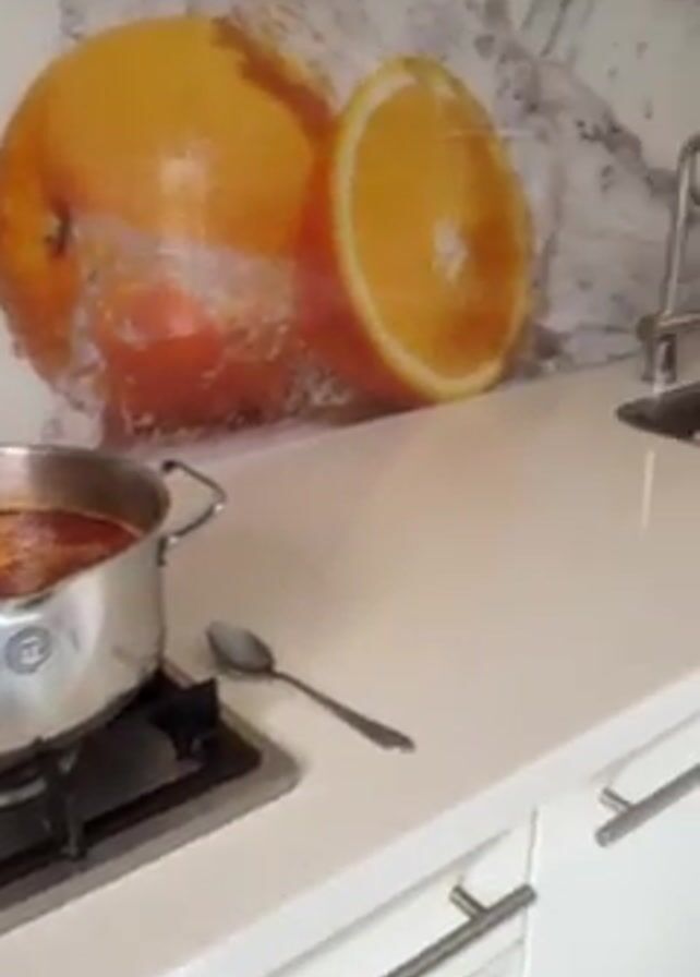 A kitchen features a pot of food on a stovetop, white cabinets with orange slice decor, and a sink with a few items in it