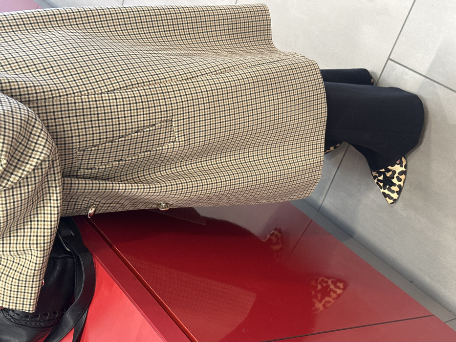 The image captures a partial view of a person indoors, from the upper torso to the feet, standing adjacent to a reflective red counter. The individual wears a long, plaid coat in beige and black, featuring silver-toned buttons and a flap pocket. Black trousers are visible beneath the coat, along with pointed-toe shoes adorned with a black and tan leopard print. A black leather-look shoulder bag, exhibiting braided strap detail, rests on the upper surface of the red counter. The counter's glossy finish reflects parts of the leopard print footwear. The floor is composed of light grey square tiles with dark grout. No identifying features are present to ascertain a specific location within Tonbridge and Malling, United Kingdom.