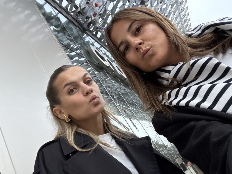 Two adult females are positioned closely, posing for a photograph, likely a selfie
