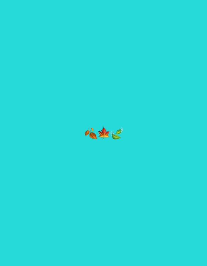 The image displays a digital graphic centered on a solid teal background. No discernible physical location in the city of Ferno, Italy, or any real-world setting, is depicted. The scene features three distinct stylized leaf objects arranged horizontally. From left to right, the first element consists of two small, ovate leaves in shades of orange and brown, one slightly overlapping the other. The central element is a single, larger, five-lobed maple leaf, colored predominantly red with orange and yellow gradients. The third element is a green, ovate leaf with three thin, white, wavy lines extending upwards and to the right from its upper edge, suggesting motion or emanation. No people are present, and no explicit actions or interactions are occurring between the depicted objects. The environment is abstract and digital.