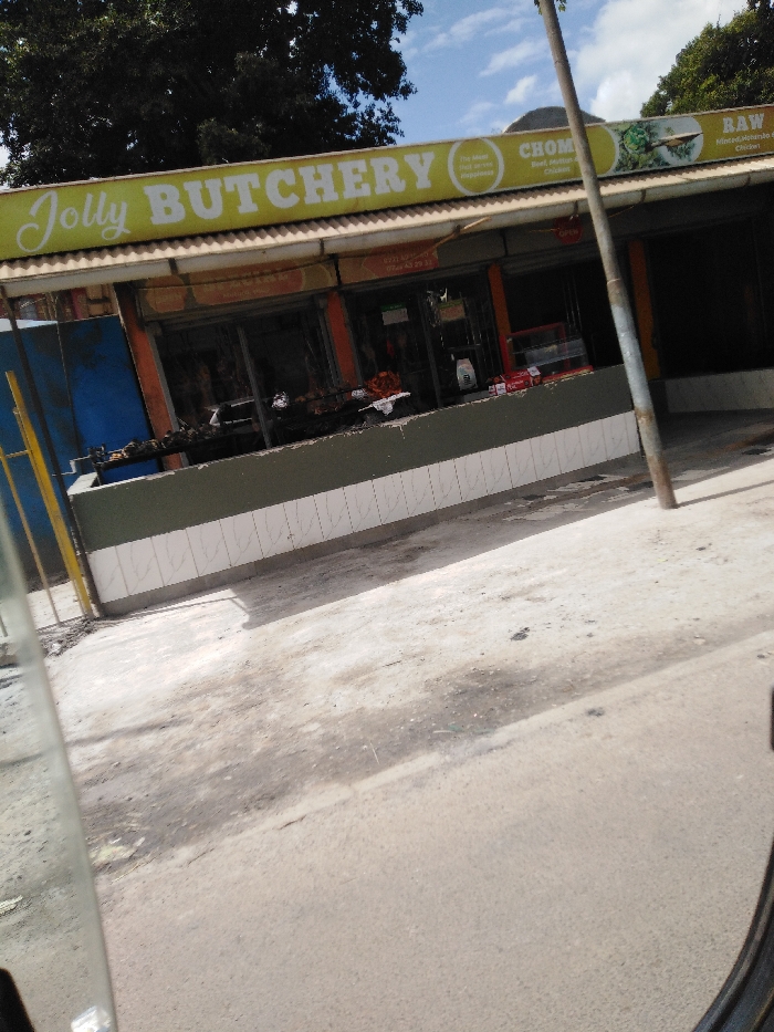 The image displays the exterior of "Jolly BUTCHERY" located in Kikuyu Township ward, Kenya