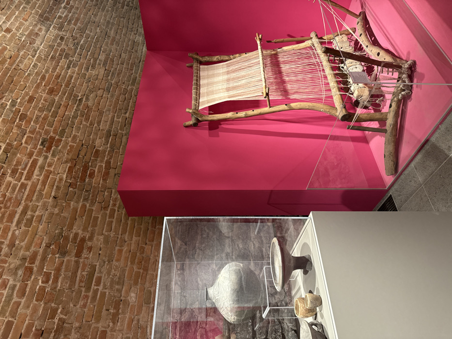 The image depicts an interior museum exhibit located in the **Archaeological Exhibition of the Bratislava City Museum, within the Old Town Hall (Stará radnica) in Bratislava, Slovakia**. The scene is dominated by two distinct display installations. On the left, a rectangular transparent glass display case rests on a light grey, solid pedestal. Inside, a collection of grey ceramic artifacts is visible, including a large, ovoid pot with textured or etched patterns, a wide, shallow bowl set on a short pedestal base, and several smaller, unadorned vessels. Behind these artifacts, an uneven dark stone wall is visible through the glass. To the right, a prominent section of wall is painted a vibrant magenta color, forming an inner corner. Against this magenta wall, a large, rustic loom is displayed. The loom is constructed from unhewn wooden branches or logs, featuring a vertical frame supporting horizontal bars. A partially woven piece of light-colored fabric, consisting of numerous parallel white warp threads, extends downwards. From the lower section of these threads, several small, pale, rectangular weights are suspended by thin strings. The base of the loom is enclosed by a low, transparent glass barrier. The upper portion of the room reveals an exposed, curved ceiling constructed from reddish-brown bricks. The floor in the foreground is dark grey, possibly stone or concrete. No individuals are present in the scene.