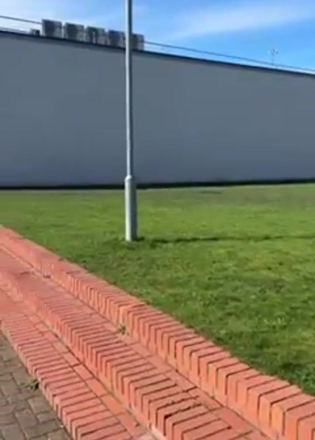 n exterior shot of a brick-lined walkway and then moves to an exterior shot of a building and surrounding structures on a sunny day. The video begins with a view of a three-tiered brick border alongside a patch of green grass. A gray building runs along the top of the frame, with a gray light pole to the left. The view then shifts and the camera moves along a brick-paved walkway. To the left is a gray fence with a grassy area beyond it. People can be seen by a building on the right. Bicycles are parked nearby. The view widens and includes a building and a grassy area with picnic tables and a fence. The sky is blue with some clouds and the sun is shining brightly. A building with cars parked nearby can be seen in the distance, partially obscured by trees.