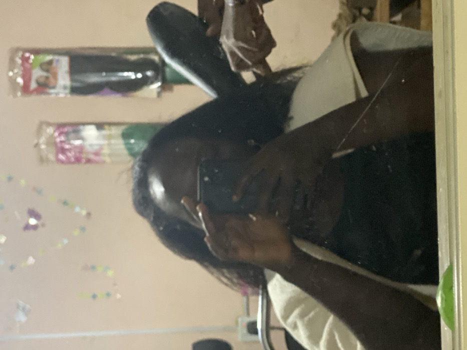 A person takes a mirror selfie with a smartphone. Her face is partially obscured by the phone. She has long, dark hair. Packages of hair extensions are visible on the wall behind her. A white towel hangs nearby. Small, colorful, decorative items are scattered on the wall near the mirror. The mirror's surface has imperfections.