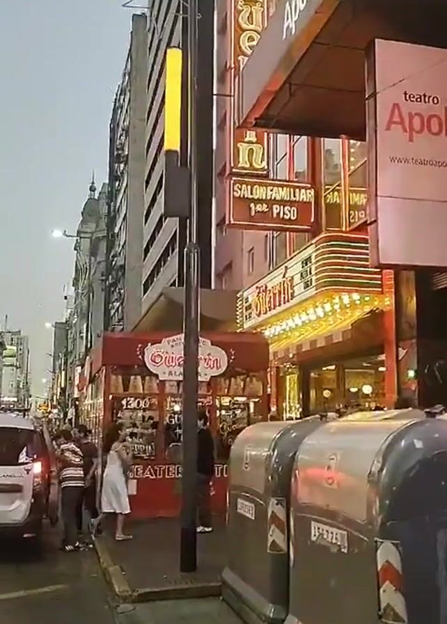 busy street scene at dusk in Buenos Aires. A large, ornate theater called Teatro Apolo, with bright neon signs, dominates the right side of the frame. In front of the theater is a red kiosk selling food, called "Guerin," with people milling around it. To the right of the kiosk are two large gray garbage containers. People are walking on the sidewalk, and a white taxi is parked on the street. Tall buildings line the street. The sky is overcast.