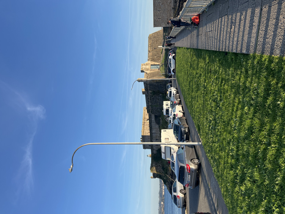The image depicts an outdoor coastal scene in La Coruña, Spain, centered on the historic Castillo de San Antón fortification. The sky is clear blue with minimal cirrus clouds. In the foreground, a paved stone promenade occupies the right side of the frame, alongside a strip of vibrant green grass. To the left of the grass is a paved road where approximately fifteen vehicles are parked in a single line, extending towards the castle. These include various sedans and hatchbacks, notably a grey Mercedes-Benz B-Class wagon (license plate 9507 JTF) in the foreground and two white camper vans. The Castillo de San Antón, a large stone fortification with battlements, stands prominently in the background on a rocky promontory. A small lighthouse structure is visible on the left side of the castle. A section of a stone wall extends from the castle towards the right. Two grey streetlights with curved arms and modern fixtures are positioned along the scene. On the paved promenade in the right foreground, a single man wearing a dark jacket stands facing the water, positioned next to a grey metal railing. A fishing rod is visible near him, resting against the railing, and an orange bag or backpack is on the ground at his feet. Several indistinct human figures are visible near the entrance area of the castle in the background. The scene is brightly lit by the sun, casting long shadows towards the right, indicating either early morning or late afternoon.