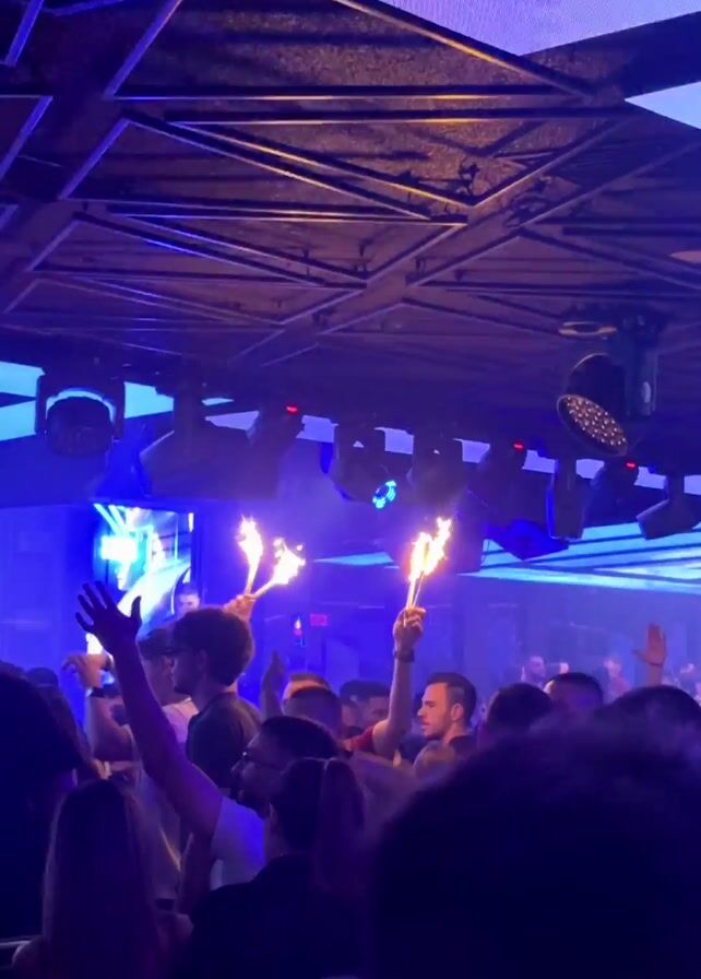 crowd of people at a nightclub. The lighting is blue and spotlights create a stage effect. Some people are holding up lit objects resembling small torches, and there is also a fog machine creating smoke. The ceiling has a geometric pattern. People are dancing and waving their hands in the air.