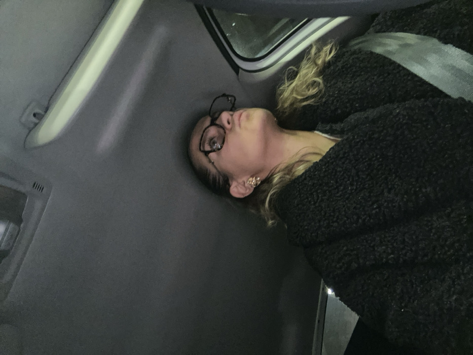 The image captures the interior of a vehicle during low light conditions. A female individual is seated on the right side of the frame, facing partially away from the camera and looking upwards and towards the left. She is wearing dark-framed eyeglasses and a gold-toned, intricate earring on her right ear. Her hair is light-colored and wavy, with some strands visible around her shoulders. She is dressed in a dark, textured coat or jacket over a white garment, and a light-colored seatbelt is fastened across her chest from her right shoulder. The vehicle's light grey headliner, an overhead console, and a light-colored interior pillar or grab handle are visible. The external environment through the window on the far right is dark and indistinct. No specific landmarks or features are present within the image to identify a precise location within the city of Saint-Étienne, France.