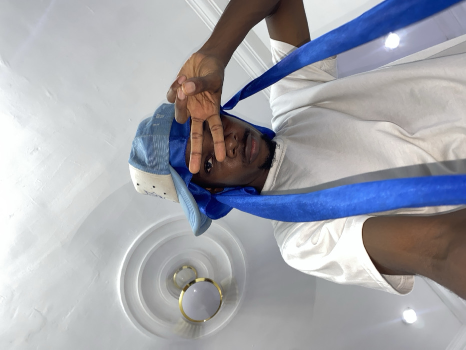 A man is seen from a low angle, looking down. He is wearing a light blue cap and a white t-shirt. A royal blue satin-like material is draped around his head. He is flashing a peace sign with his right hand. The background is a white ceiling with a decorative light fixture that has concentric circles around it and gold accents.