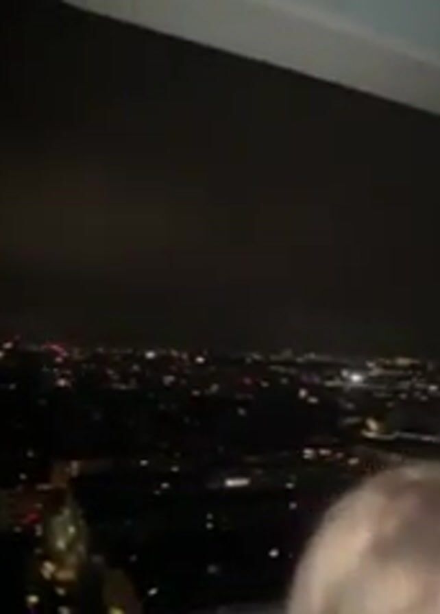 From a high vantage point, possibly a balcony, a nighttime cityscape sprawls below, punctuated by numerous bright lights indicating buildings and streets